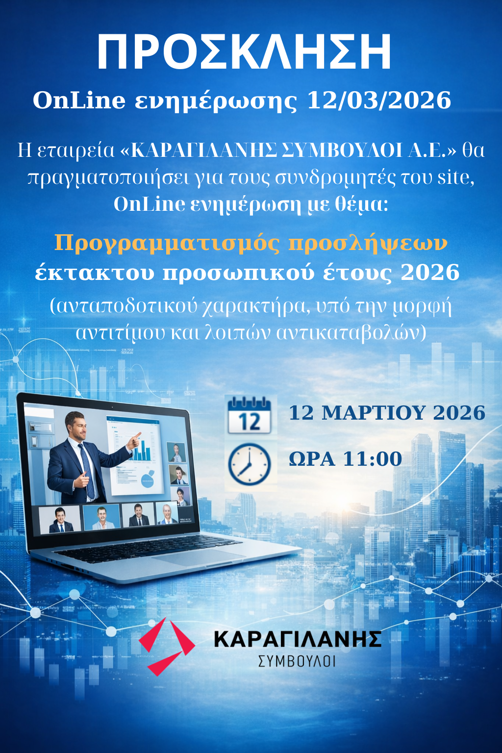 Η εταιρεία «ΚΑΡΑΓΙΛΑΝΗΣ ΣΥΜΒΟΥΛΟΙ Α.Ε.» θα πραγματοποιήσει για τους συνδρομητές του site, OnLine ενημέρωση με θέμα:
