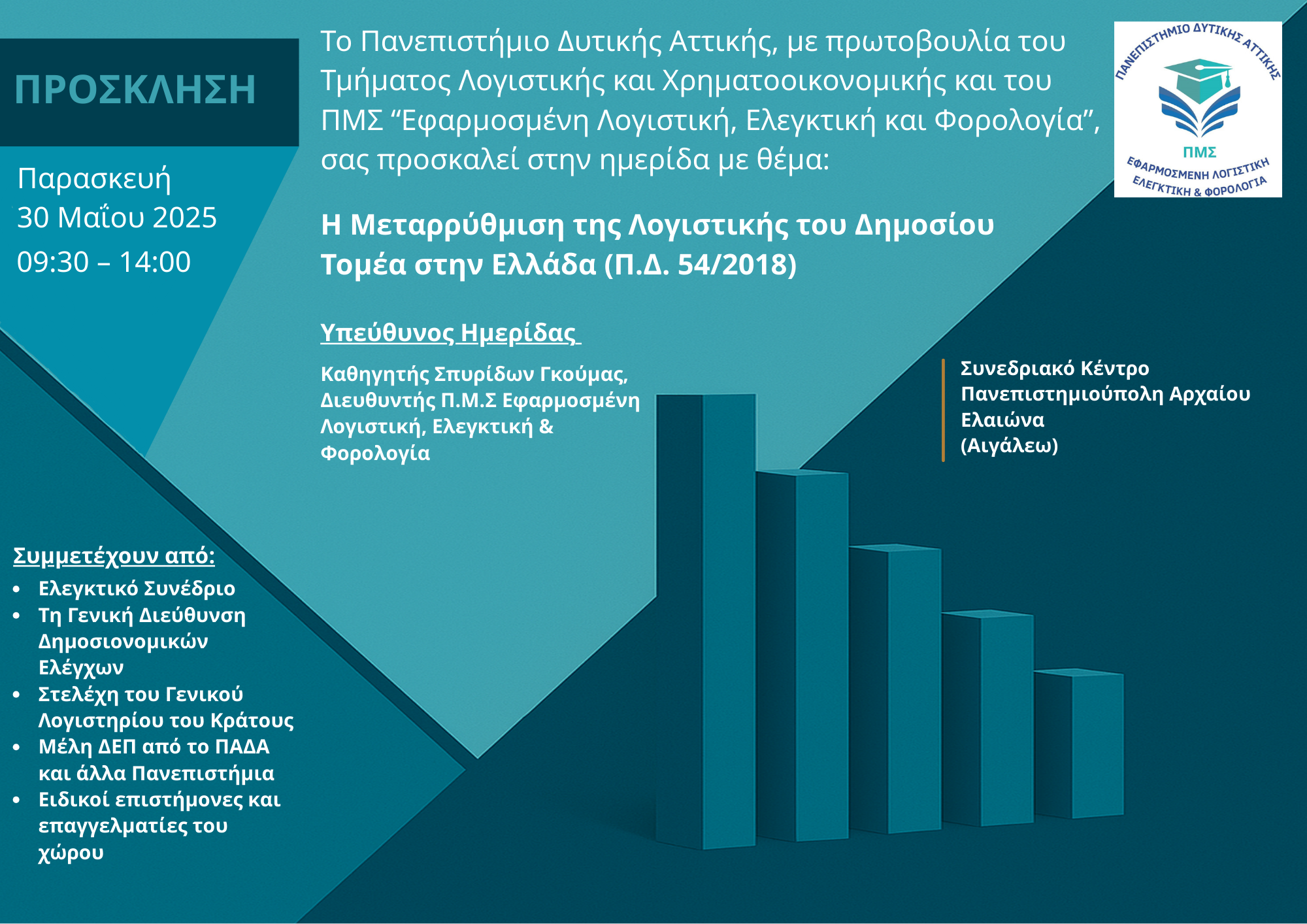 Το Πανεπιστήμιο Δυτικής Αττικής, με πρωτοβουλία του Τμήματος Λογιστικής και Χρηματοοικονομικής και του ΠΜΣ “Εφαρμοσμένη Λογιστική, Ελεγκτική και Φορολογία”, διοργανώνει ημερίδα με θέμα: